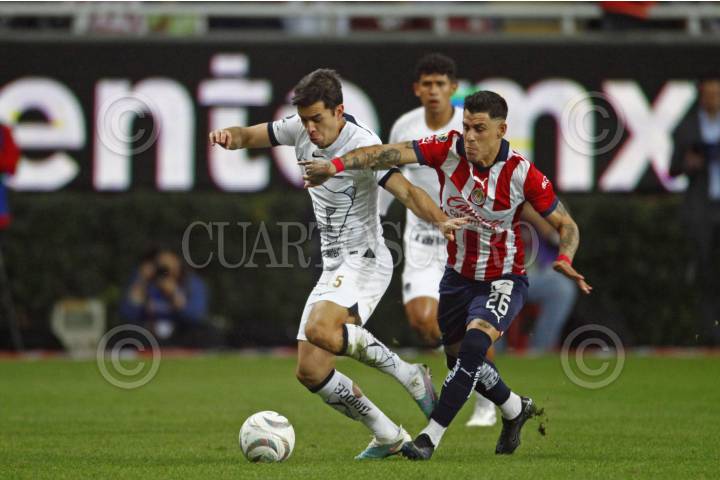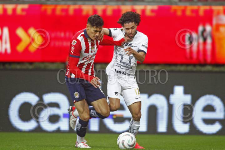 ZAPOPAN, JALISCO, 30NOVIEMBRE2023.-Adrián Aldrete jugador de Pumas disputa el balón con el contrario de Chivas, Rolando Cisneros, esto en partido correspondiente a los Cuartos de Final de ida del Torneo Apertura Temporada 2023-2024 de la Liga MX, en donde se enfrentan los equipos de Chivas vs Pumas en juego que se lleva a cabo en el Estadio Akron, el marcador al momento es de 0-0. FOTO: FERNANDO CARRANZA GARCIA / CUARTOSCURO.COM