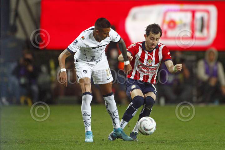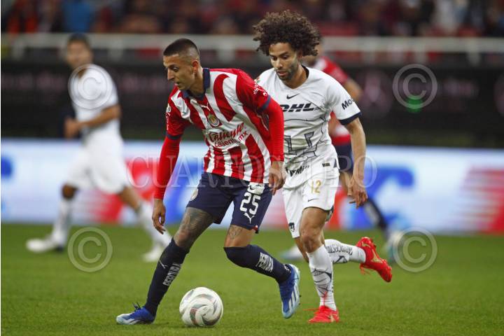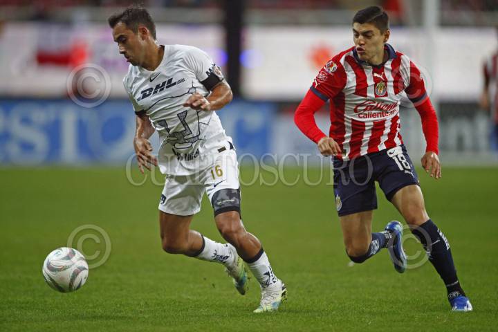 ZAPOPAN, JALISCO, 30NOVIEMBRE2023.-Roberto Alvarado jugador de Chivas disputa el balón con el contrario de Pumas, Cesar Huerta, esto en partido correspondiente a los Cuartos de Final de ida del Torneo Apertura Temporada 2023-2024 de la Liga MX, en donde se enfrentan los equipos de Chivas vs Pumas en juego que se lleva a cabo en el Estadio Akron, el marcador al momento es de 0-0. FOTO: FERNANDO CARRANZA GARCIA / CUARTOSCURO.COM
