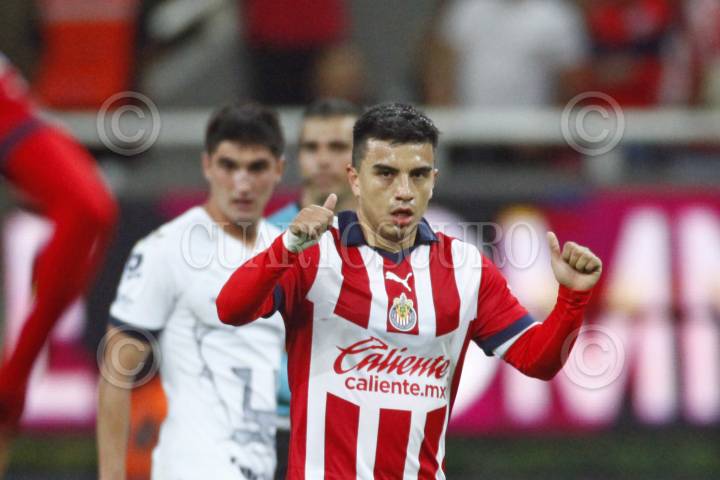 ZAPOPAN, JALISCO, 30NOVIEMBRE2023.-Fernando Beltrán jugador de Chivas celebra su anotación, esto en partido correspondiente a los Cuartos de Final de ida del Torneo Apertura Temporada 2023-2024 de la Liga MX, en donde se enfrentan los equipos de Chivas vs Pumas en juego que se lleva a cabo en el Estadio Akron, el marcador al momento es de 0-0. FOTO: FERNANDO CARRANZA GARCIA / CUARTOSCURO.COM