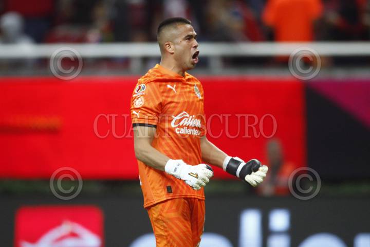 ZAPOPAN, JALISCO, 30NOVIEMBRE2023.-Miguel Jiménez Portero de Chivas, celebra la anotación de su equipo, esto en partido correspondiente a los Cuartos de Final de ida del Torneo Apertura Temporada 2023-2024 de la Liga MX, en donde se enfrentan los equipos de Chivas vs Pumas en juego que se lleva a cabo en el Estadio Akron, el marcador al momento es de 0-0. FOTO: FERNANDO CARRANZA GARCIA / CUARTOSCURO.COM
