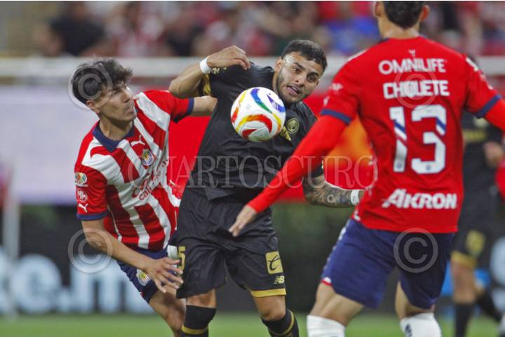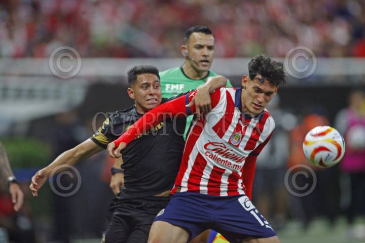 ZAPOPAN, JALISCO, 08MAYO2024.-Jesús Orozco jugador de Chivas, disputa el balón con el contrario de Toluca, Juan Domínguez, esto en partido correspondiente a los Cuartos de Final de Ida del Torneo Clausura 2024 de la Liga MX, en donde se enfrentan los equipos de Chivas vs Toluca, en juego que se lleva a cabo en el Estadio Akron, el marcador al momento es 0-0. FOTO: FERNANDO CARRANZA GARCIA / CUARTOSCURO.COM