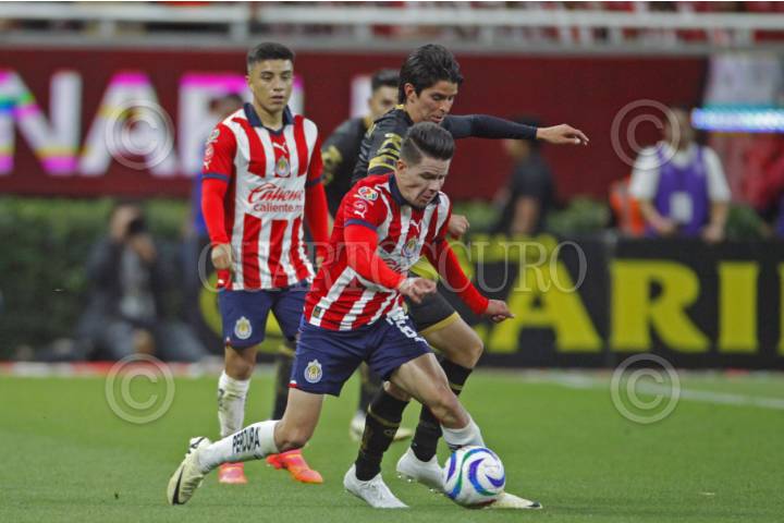 ZAPOPAN, JALISCO, 08MAYO2024.-Alexis Vega jugador de Toluca, disputa el balón con el contrario de Chivas, Erick Gutiérrez, esto en partido correspondiente a los Cuartos de Final de Ida del Torneo Clausura 2024 de la Liga MX, en donde se enfrentan los equipos de Chivas vs Toluca, en juego que se lleva a cabo en el Estadio Akron, el marcador al momento es 0-0. FOTO: FERNANDO CARRANZA GARCIA / CUARTOSCURO.COM
