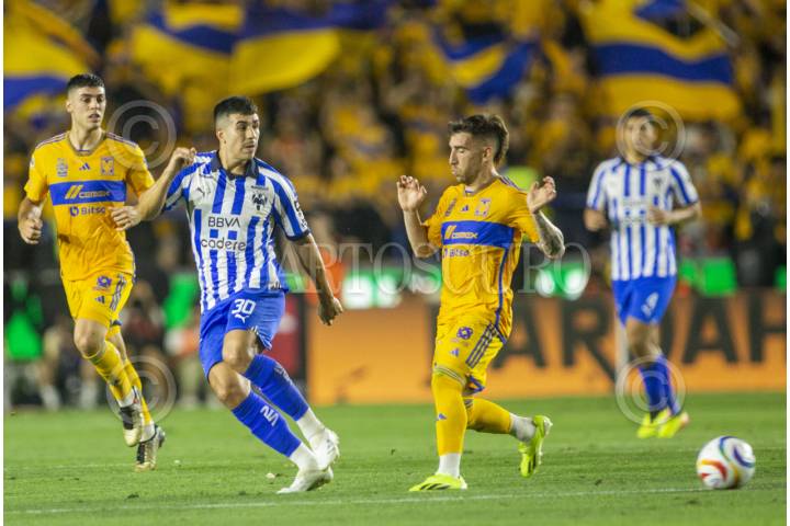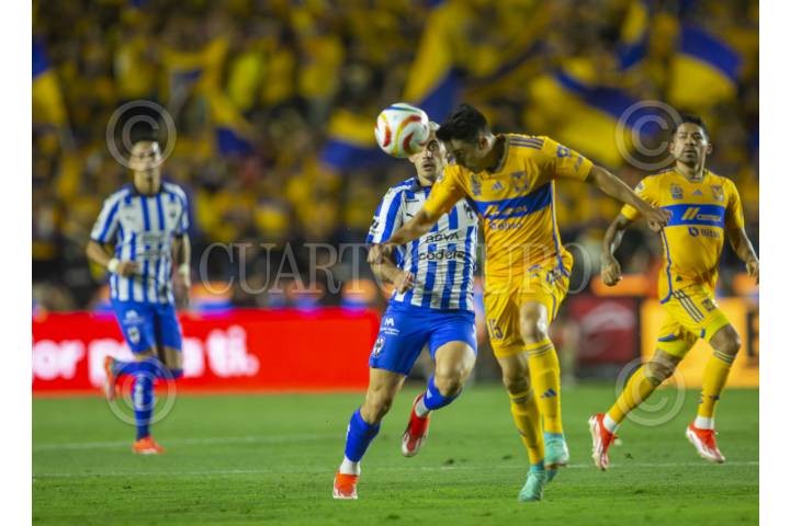 SAN NICOLÁS DE LOS GARZA, NUEVO LEÓN, 09MAYO2024.- Fernando Gorriarán de Tigres, se disputa el balón con Jorge Rodríguez de los Rayados del Monterrey, en el estadio Universitario, partido correspondiente a la ida de Cuartos de final de la Clausura 2024, de la Liga MX. Marcador Final: Tigres: 1 - Monterrey: 2. FOTO: GABRIELA PÉREZ MONTIEL / CUARTOSCURO.COM