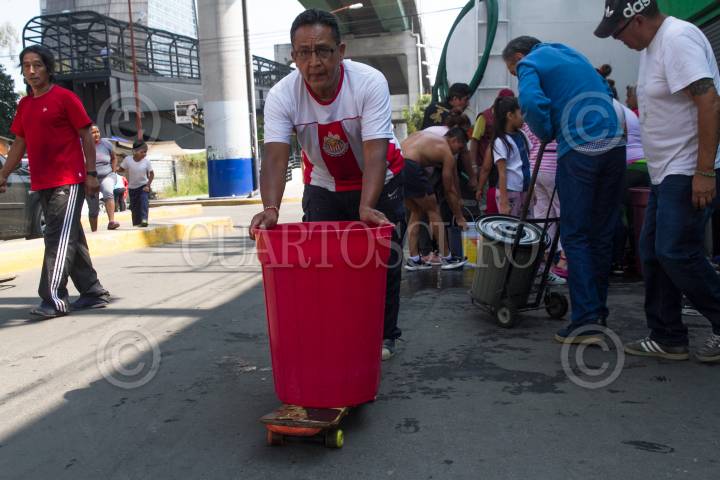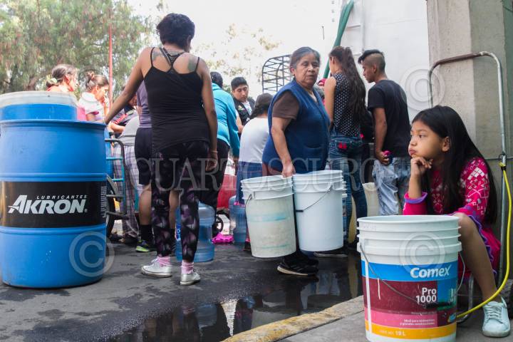 CIUDAD DE MÉXICO, 07NOVIEMBRE2018.- Ante el desabasto de agua los vecinos de la colonia Santa María la Ribera y la Tabacalera acuden a los tinacos colocados por la delegación para surtirse con cubetas, botes y tambos del vital líquido, y es que las obras del Sistema Cutzmala, el cual da agua potable a gran parte de la capital, presentó fallas en las reparaciones que se le hicieron el fin de semana pasado, por lo que el corte se ha largado una semana, Conagua anunció que hasta el sábado o domingo se restablezca el servicio al cien por ciento. FOTO: MOISÉS PABLO /CUARTOSCURO.COM