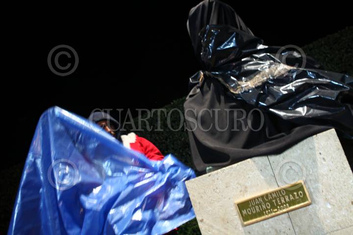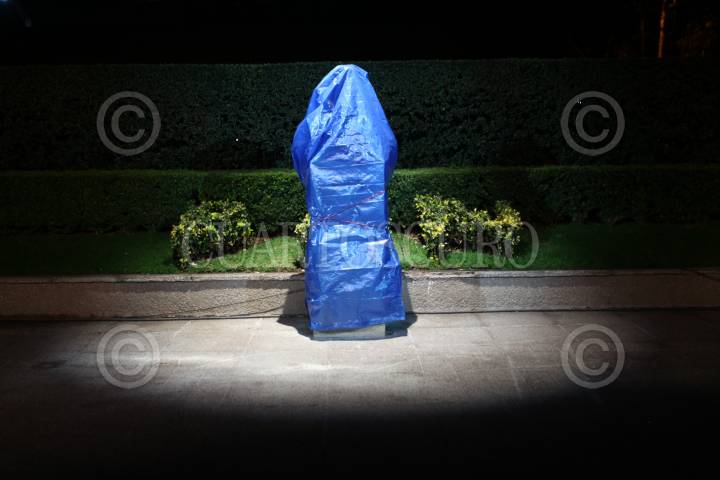 MÉXICO, D.F., 03NOVIEMBRE2010.- Un trabajador cubre con una lona el Busto de Juan Camilo Mouriño que yace cubierto por una bolsa de plástico en las instalaciones del Comité Ejecutivo Nacional del PAN previo a ser develado el día de mañana durante un homenaje por los dos años de su fallecimiento. FOTO: MISAEL VALTIERRA/CUARTOSCURO.COM