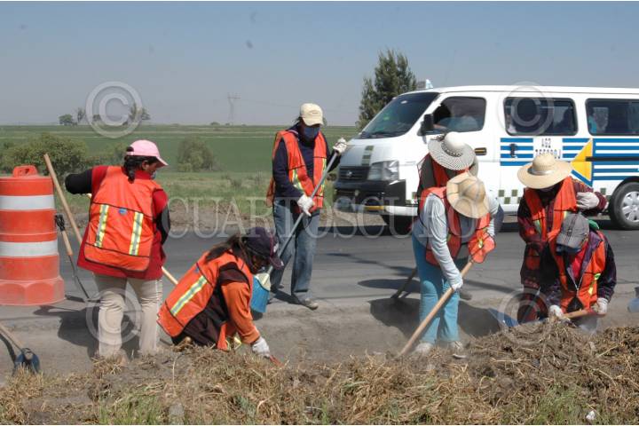 TEQUIXQUICAC, EDO. DE MÉXICO, 30ABRIL2009.- Trabajadoras del ayuntamiento local trealizan labores de limpieza sobre la carretera con cubrebocas para protegerse del virus de la influenza. FOTO: MARIO NULO/CUARTOSCURO.COM