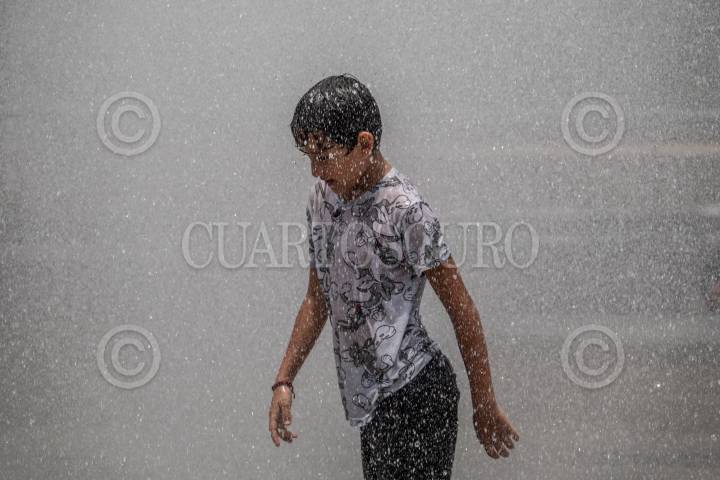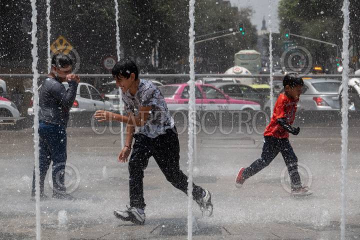 Niños aprovechan las fuentes de la Plaza Tlaxcoaque ubicada en el corazón del Centro Histórico para refresacarse de las altas temperaturas que imperan la tarde en la Ciudad