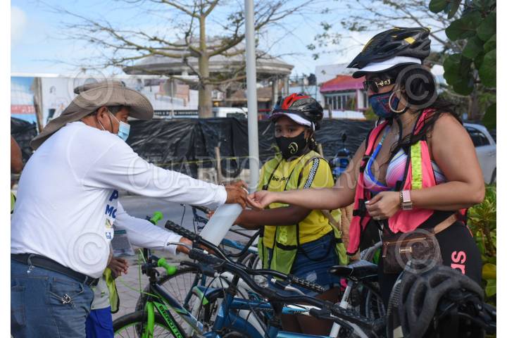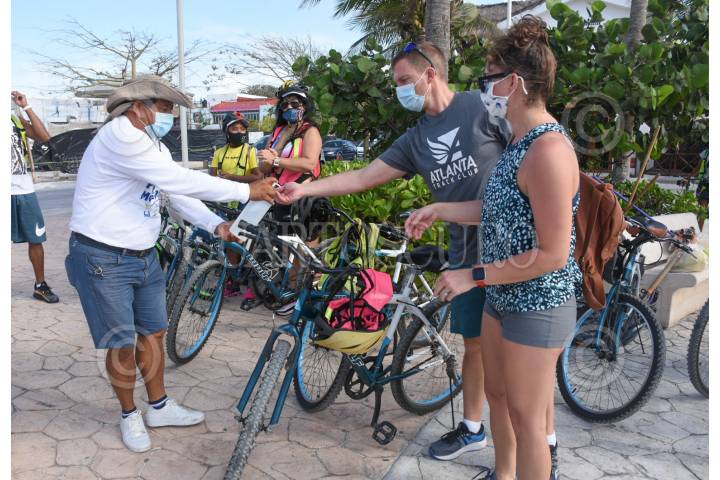 Se ofrece gel antibacterial y cubrebocas a los turistas para mantener contraído los contagios en Puerto Morelos.