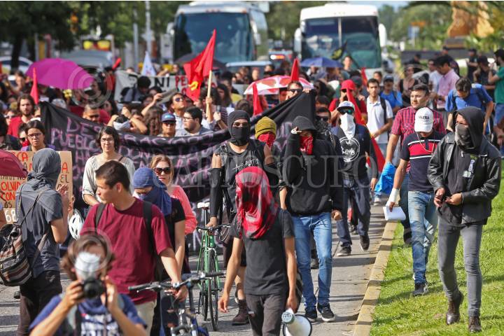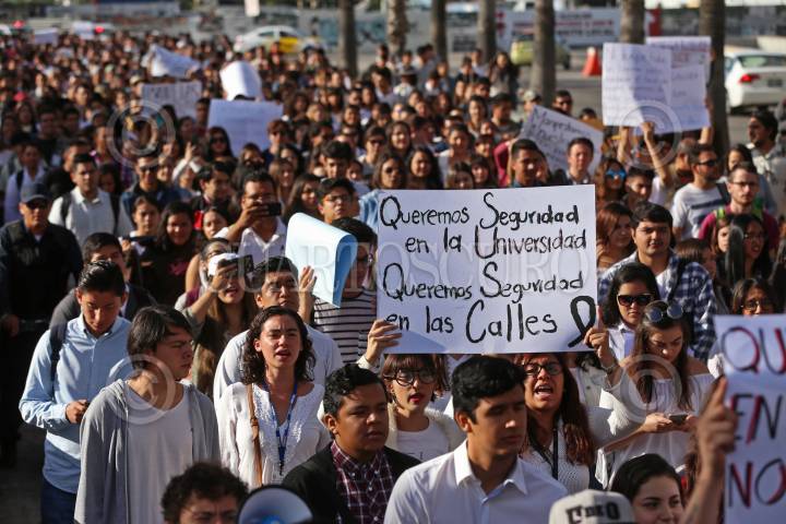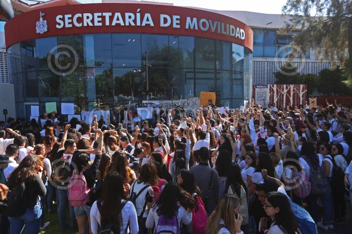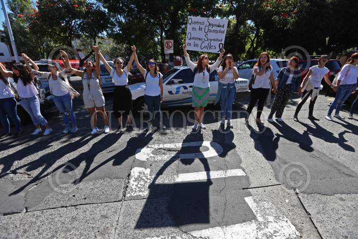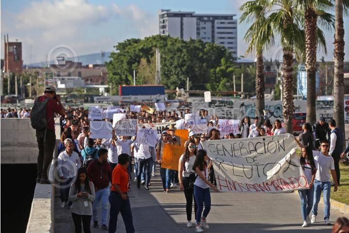 GUADALAJARA, JALISCO, 09OCTUBRE2018.- Cientos de Alumnos del Centro Universitario de Ciencias Sociales y Humanidades (CUCSH) de la Universidad de Guadalajara, se manifestaron y marcharon de su centro universitario hasta las Secretaria de Movilidad para protestar por la inseguridad que sufren los estudiantes, ya que el día de ayer una joven fue atropellada por una unidad de Transporte Publico la cual falleció y otra mas perdió la vida en un intento de asalto. FOTO: FERNANDO CARRANZA GARCIA/CUARTOSCURO.COM