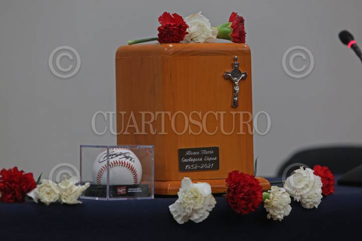 Una pelota de béisbol y la urna donde se encuentran las cenizas del ex Guerrillero , esto durante el homenaje póstumo Álvaro Mario Cartagena López.