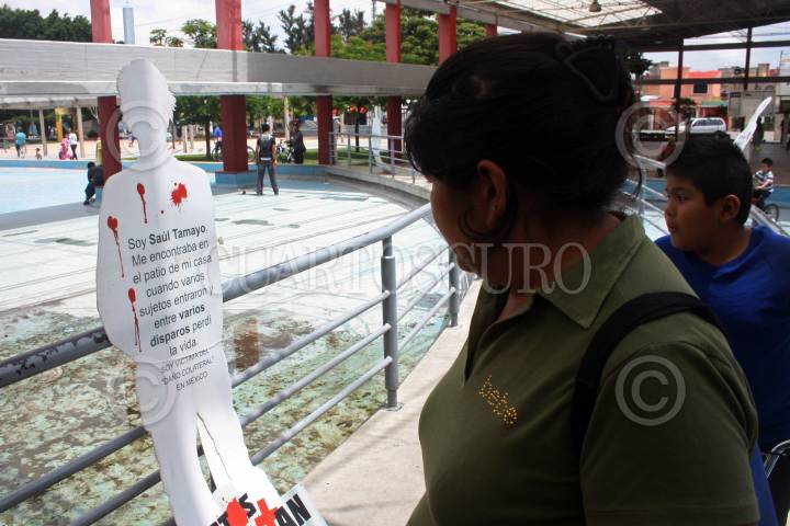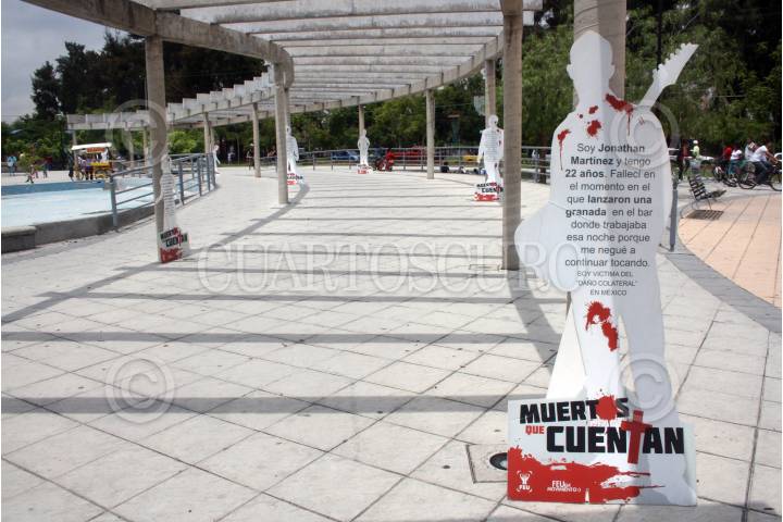 GUADALAJARA, JALISCO, 15JULIO2012.- El día de hoy en el parque San Jacinto de esta ciudad, la Federación de Estudiantes Universitarios (FEU) realizo una exposición de siluetas humanas, misma que lleva el nombre de "Muertos que Cuentan" esto como un llamado a la las autoridades bajo la consigna de no mas sangre y no mas víctimas de los daños colaterales provocados por el crimen organizado en México. FOTO: FERNANDO CARRANZA /CUARTOSCURO.COM