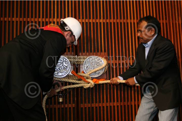 MÉXICO D.F. 10ABRIL2008.-Diputados del Frente Amplio Progresista toman la tribuna al momento de discutir un tema de migración durante la sesión en la Cámara de Diputados.En la imagen el diputado Alfonso Suarez del Real y Alejandro Sanchez (PRD), colocan una cuerda en una de las puerta por donde entran los diputados del PAN. FOTO: GUILLERMO PEREA /CUARTOSCURO.COM