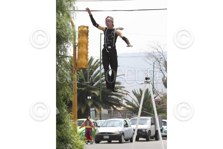 COACALCO, ESTADO DE MEXICO., 03ABRIL 2011.- Un equilibrista caracterizado de payaso realiza la suerte de la cuerda floja sobre la avenida Mexiquense y la carretera Coacalco-Tultepec. FOTO: LM ACEVEDO/CUARTOSCURO.COM