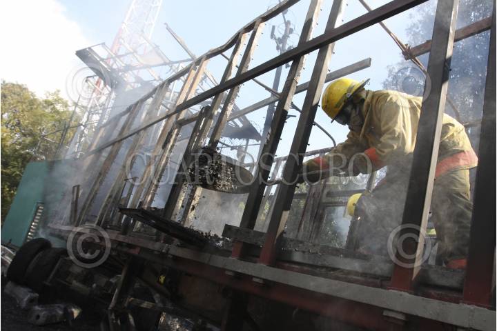 CUERNAVACA, MORELOS., 06ENERO2013.- En la carretera Cuernavaca-México a la altura del kilómetro 93+8oo, un tráiler de doble remolque se impacto en una antena de CAPUFE quedando en cenizas la cabina y uno de los remolques, que transportaba materiales para la construcción. FOTOS: ALMA LAFAYET /CUARTOSCURO.COM
