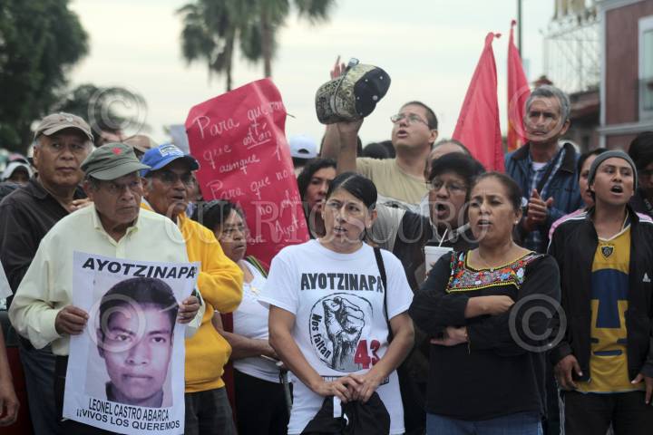 CUERNAVACA, MORELOS, 26SEPTIEMBRE2015.- Integrantes de organizaciones civiles y público en general participaron en la marcha de protesta a un año de la desaparición de 43 estudiantes de Ayotzinapa. Los manifestantes se plantaron en la explanada del Palacio de Cortés, donde colocaron fotografías de los jóvenes desaparecidos, flores y pancartas. Para finalizar realizaron un mitin. FOTO: PATRICIA MORALES /CUARTOSCURO.COM