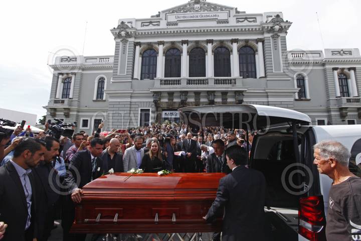 La llegada del cuerpo del Ex Rector General y Presidente de la Feria Internacional del Libro de Guadalajara (FIL), Raúl Padilla López a las instalaciones del Paraninfo Enrique Díaz de León de la Universidad de Guadalajara (UdeG).