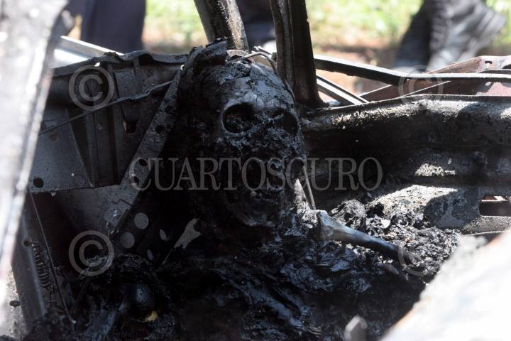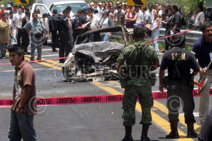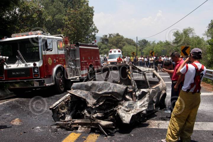 JUCHITEPEC, ESTADO DE MÉXICO, 18JULIIO2009.- Choque entre un auto Volks Waguen tipo Caribe contra un camion de pasajeros en el Km 56 mas 300 de la carretera Xochimilco Oaxtepec, Municipio de Juchitepec; dejando un saldo de tres personas calcinadas del auto compacto, por lo que asistieron elementos de la Procuraduria Mexiquense para dar Fe de los hechos y realizar el levantamineto de los cuerpos. FOTO: LUIS CARBAYO/CUARTOSCURO.COM