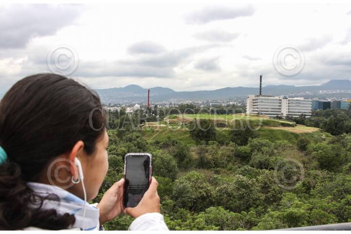 Mujer toma fotografía a la pirámide de Cuicuilco desde puente peatonal.