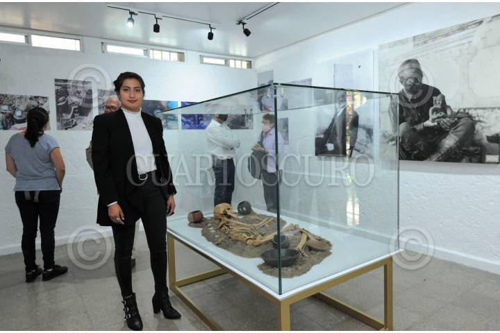 La antropóloga Brenda García Hernández, directora de la Zona arqueológica de Cuicuilco, posa junto a la exposición con motivo de los 100 años de inicios de los trabajos en la zona.