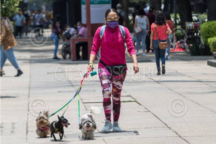 Una mujer paseo con sus perritos en Paseo de la Reforma.