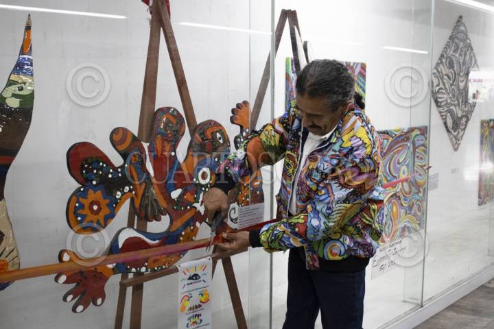 CIUDAD DE MÉXICO. 12SEPTIEMBRE2025.- Mauricio Siller Obregón inauguró exposición en la estación Zaragoza de la Línea 1 del metro. Acompañado por amigos. Tiene una larga trayectoria, anteriormente mostró su trabajo en el metro de Berlín y de París. FOTO: CAMILA AYALA BENABIB / CUARTOSCURO.COM