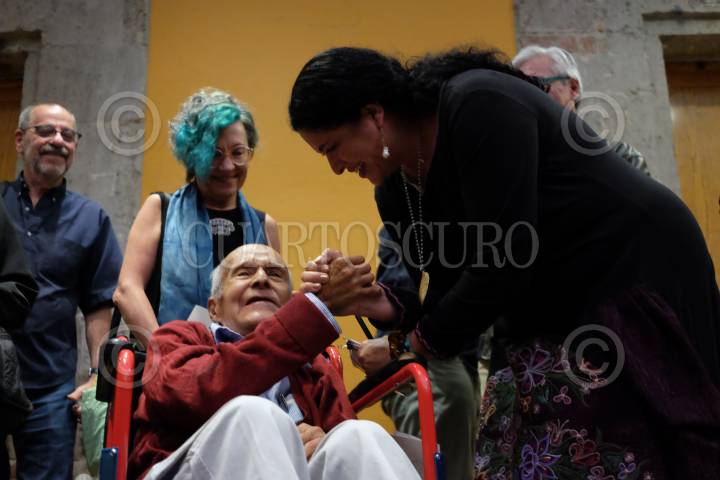 CIUDAD DE MÉXICO, 05JUNIO2019.- Alejandra Frausto, secretaria de Cultura; Elena Navarro, directora del Centro de la Imagen y Horacio Fernández, curador de la obra, encabezaron la Inauguración de la muestra: Fotos en libros, libros de fotos, la cual incluye 92 piezas de diferentes fotógrafos latinoamericanos y extranjeros de los fondos del Consejo Mexicana de Fotografía, en el centro de la Imagen. En la imagen el fotógrafo José Luis Neira y Alejandra Frausto, secretaria de Cultura, se saludaron. FOTO:GRACIELA LÓPEZ /CUARTOSCURO.COM