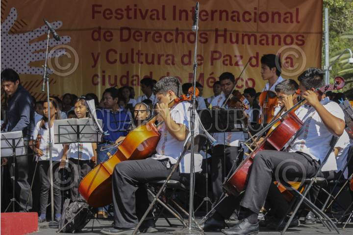 MEXICO, D.F.,08DICIEMBRE2013- La Orquesta Renacimiento, proveniente del estado de Guerro e integrada por niños, se presenta como parte del programa en el Festival Internacional de Derechos Humanos, el cual fue inaugurado el día de hoy por la Ombudsman de la CNDH en el D.F., en compañía de la embajadora de España en México, pues este país fungió como invitado especial. FOTO: DAVID POLO /CUARTOSCURO.COM