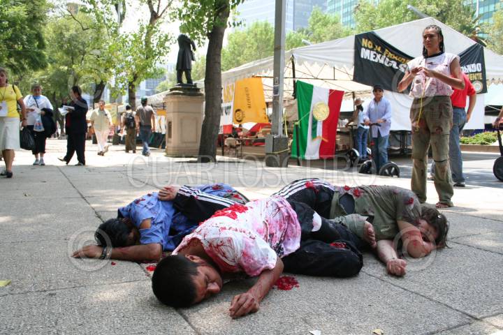 MÈXICO, D.F. 12AGOSTO2006.- Dentro del plantòn ubicado en Paseo de la Reforma se han habilitado exposiciones y actividades culturales, donde los habitantes participan activamente. En la imagen, un grupo de performers realizan una acciòn frenta a los campamentos. FOTO: Paola HIdalgo/CUARTOSCURO.COM