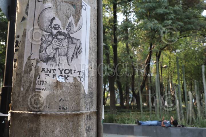 CIUDAD DE MÉXICO, 28MARZO2024. Extranjeros pasean por calles de la colonia Roma, trayendo consigo el fenómeno de la gentrificación, donde la población local se ha visto afectada con la subida de precios en distintos servicios. Un cartel pegado en un poste con la figura de Emiliano Zapata con pose del Tío Sam ilegible en su mensaje da cuenta de la mezcla de culturas de la colonia. FOTO: EDGAR NEGRETE LIRA/CUARTOSCURO.COM