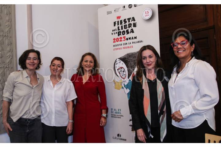 Imelda Martorell, coordinadora de Universo de Letras; Anel Pérez, directora de Literatura y Fomento a la Lectura UNAM; Rosa Beltran, coordinadora Cultura UNAM; Socorro Venegas, directora General de Publicaciones y Fomento Editorial UNAM y Yael Weiss, editora digital de la Revista Universidad de México durante conferencia de prensa para hablar de la próxima edición debla Fiesta del Libro y la Rosa (FLyR) que se llevará a cabo en el Centro Cultural Universitario y sedes externas, del 21 al 23 de abril.