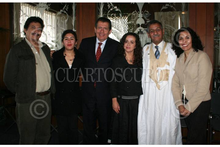 MÉXICO, D.F. 15NOVIEMBRE2006.- Ahmed Mulay Ali Hamadi, embajador de la República Árabe Saharaui Democrática, Victor Hugo Rascón Banada, director de la SOGEM, los actores Carmen Luna, Silvia Guevara y Antonio Serna y Elizabeth Solís, encargada de cultuta de AMARAS durante la conferencia de prensa que ofrecieron para anunciar la nueva temporaca teatral que la compañía "La Trouppe" en beneficio de la comunidad de niños saharaui de los campamentos de refugiados. FOTO: PAOLA HIDALGO/CUARTOSCURO.COM