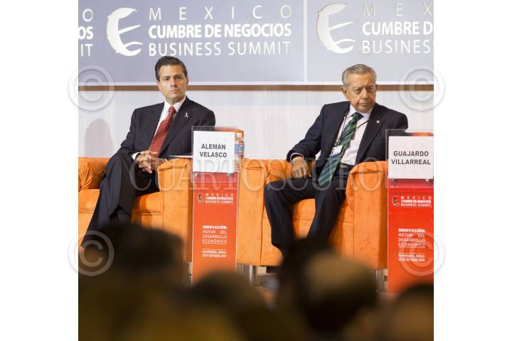 GUDALAJARA, JALISCO, 26OCTUBRE2015.- En su participación en la 13ª Edición de México Cumbre de Negocios, el Presidente Enrique Peña Nieto informó que México avanzó 14 lugares en el reporte Doing Business del Banco Mundial al pasar del lugar 53 al 39, y destacó que el Indicador Global de la Actividad Económica señala que, al mes de agosto, la economía del país creció 2.6 por ciento a tasa anual. En la imagen lo acompaña el ex gobernador de Veracruz Miguel Alemán Velasco. FOTO: PRESIDENCIA /CUARTOSCURO.COM