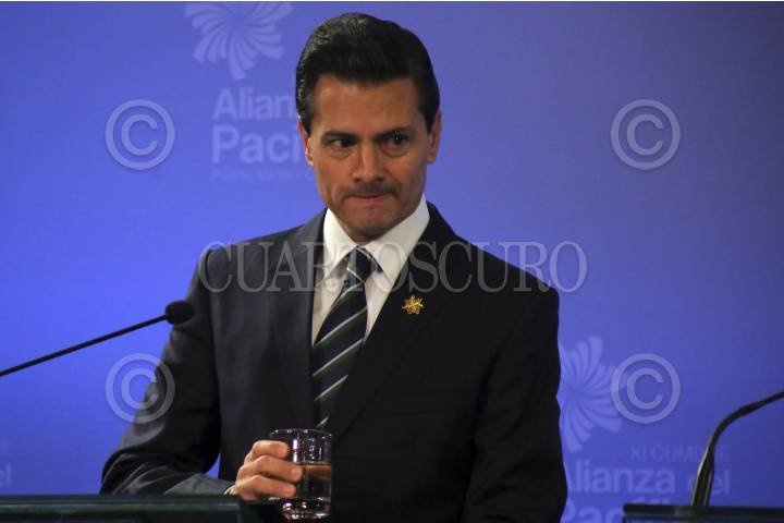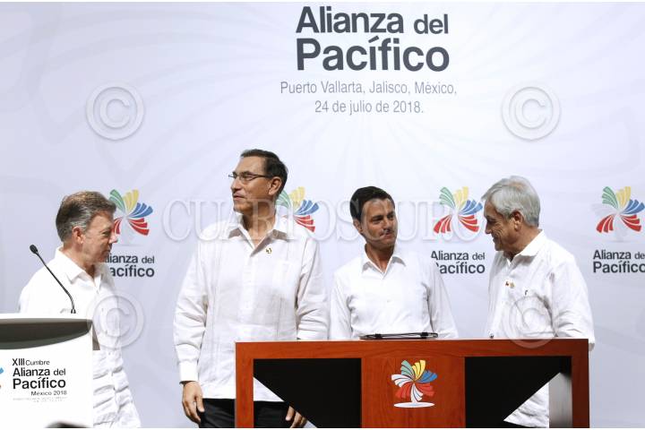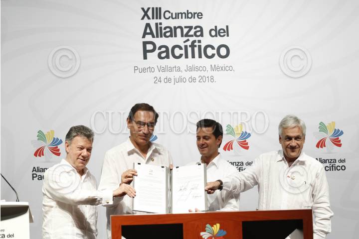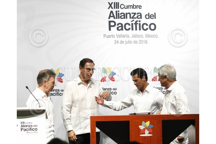 PUERTO VALLARTA, JALISCO, 24JULIO2018.- Enrique Peña Nieto, presidente de México, Martin Vizcarra, presidente de Peru, Sebastian Piñeira, presidente de Chile y Juan Manuel Santos, presidente de Colombia, durante la firma de la declaratoria final de la Xlll cumbre Alianza del Pacífico. FOTO: SAÚL LÓPEZ /CUARTOSCURO.COM