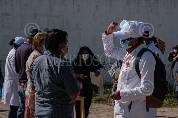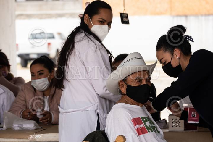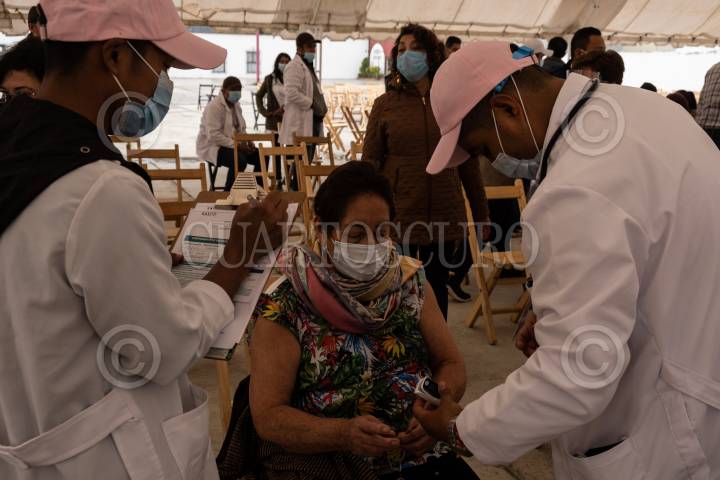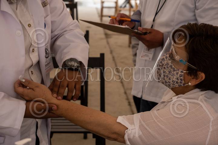 Trabajadores de la Secretaria de Salud del estado toman los signos vitales de una mujer antes de ser vacunada contra Covid 19.