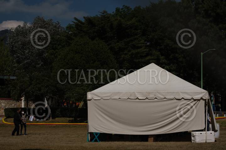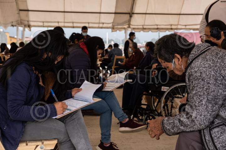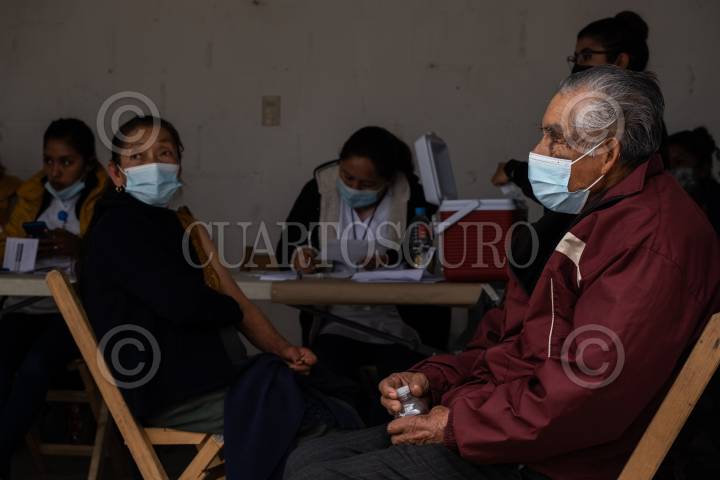 Un hombre espera mientras empleados de la Secretaria de Bienestar toman sus datos antes de ser vacunados contra Covid 19.