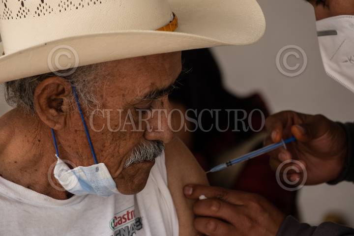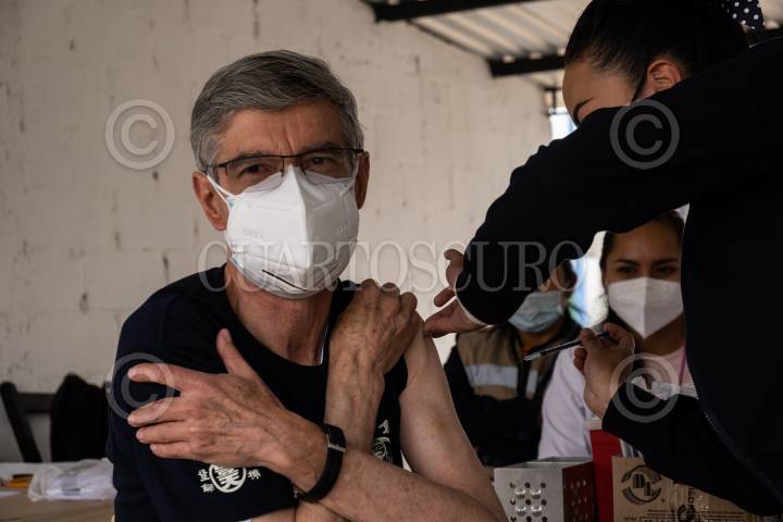 Un hombre mayor de sesenta años es vacunado contra Covid 19. La vacuna aplicada es del laboratorio chino Sinovac y requiere una segunda dosis después de 28 días de la primera aplicación.