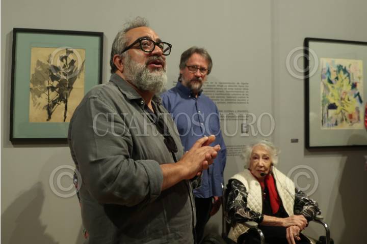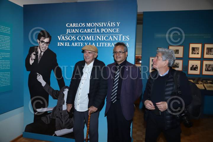 El artista Armando Coen, el curador Ángel Aurelio González Amozorrutia y el fotógrafo Rogelio Cuéllar durante la presentación de la exposición “Carlos Monsiváis y Juan García Ponce. Vasos comunicantes en el arte y la literatura”, en el Museo d