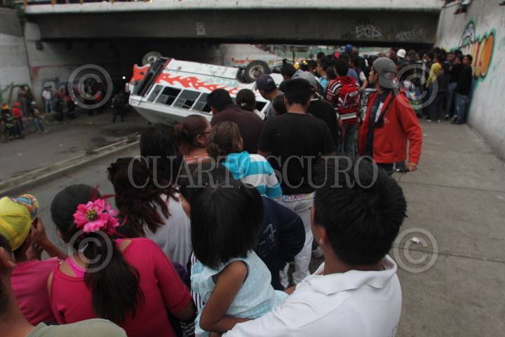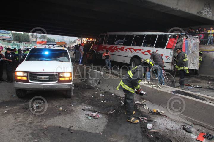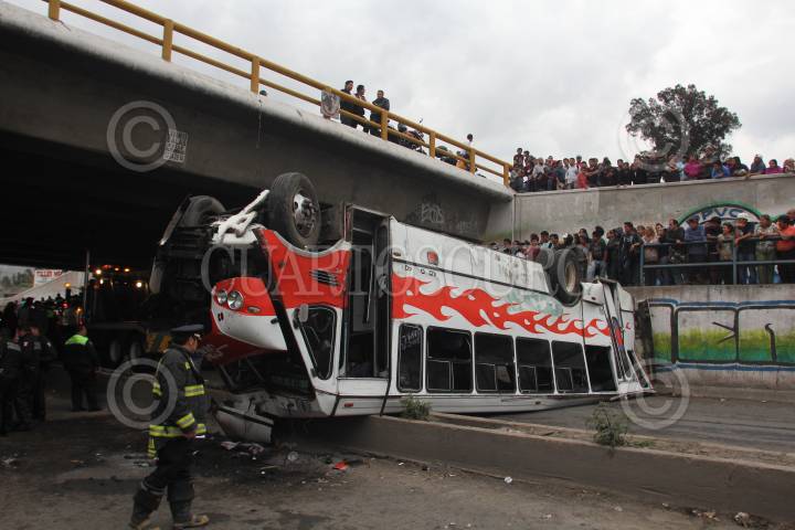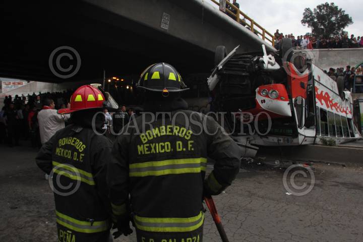 MÉXICO, D.F., 02JULIO2012.- Un hombre perdió la vida tras volcar un camión de pasajeros de la ruta Santa María que circulaba sobre los carriles laterales de la autopista México Puebla. Debido al exceso de velocidad y a que la unidad se quedo sin frenos, el pasado vehículo se proyectó sobre los muros de contención del eje 10 Oriente en los límites de la delegación Tlahuac y el municipio de Valle de Chalco. FOTO: SAÚL LÓPEZ /CUARTOSCURO.COM FOTO: SAÚL LÓPEZ /CUARTOSCURO.COM