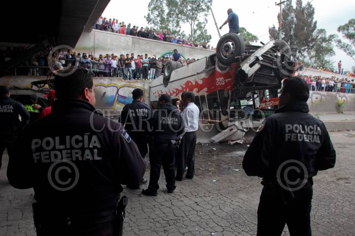 MÉXICO, D.F., 02JULIO2012.- Un hombre perdió la vida tras volcar un camión de pasajeros de la ruta Santa María que circulaba sobre los carriles laterales de la autopista México Puebla. Debido al exceso de velocidad y a que la unidad se quedo sin frenos, el pasado vehículo se proyectó sobre los muros de contención del eje 10 Oriente en los límites de la delegación Tlahuac y el municipio de Valle de Chalco. FOTO: SAÚL LÓPEZ /CUARTOSCURO.COM