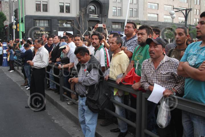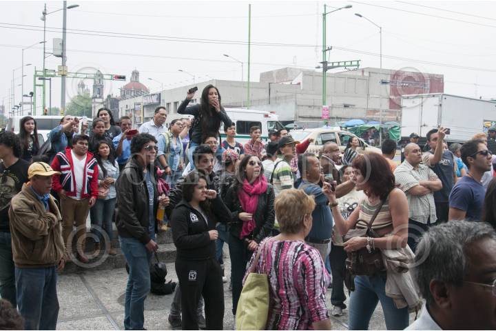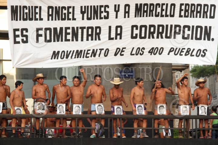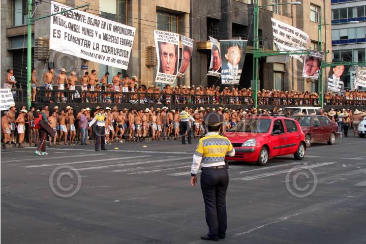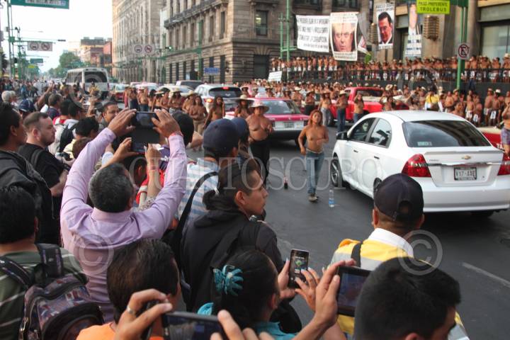 MÉXICO, D.F., 21ABRIL2015.- Decenas de curiosos se detiene a observar a los integrantes de los 400 pueblos que se manifestaron semi –desnudos en el Cruce de las avenidas Eje Central y Juárez para exigir resuelvan apoyos al campo en el estado de Veracruz. FOTO: SAÚL LÓPEZ /CUARTOSCURO.COM