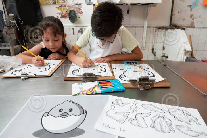 Bárbara y Mattias colorean la figura de un pollo durante el curso de verano en la Pollería Tere en Mi Mercado Agricola Oriental