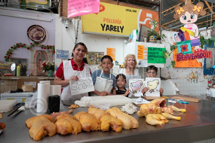 Las polleras y talleristas Mayeli y la señora Tere acompañadas de los niños Tadeo, Bárbara y Matías durante el curso de verano en la Pollería Tere en Mi Mercado Agricola Oriental