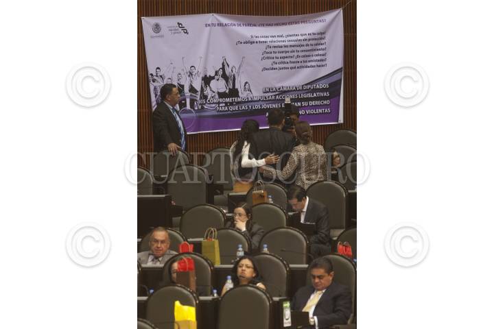MÉXICO, D.F., 14FEBRERO2013.-Diputados perredistas se toman una foto frente a la manta colocada por miembros de la Comisión de Equidad de Género este día de San Valentín en la sesión ordinaria en San Lázaro. FOTO: JUAN PABLO ZAMORA /CUARTOSCURO.COM