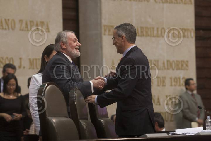MÉXICO, D.F., 14FEBRERO2013.- Jaime Mayor Oreja, Eurodiputado del conservador Partido Popular (España) de visita en la cámara de Diputados, saluda al diputado panista José González Morfín, vicepresidente de la mesa Directiva en San Lázaro. FOTO: JUAN PABLO ZAMORA /CUARTOSCURO.COM