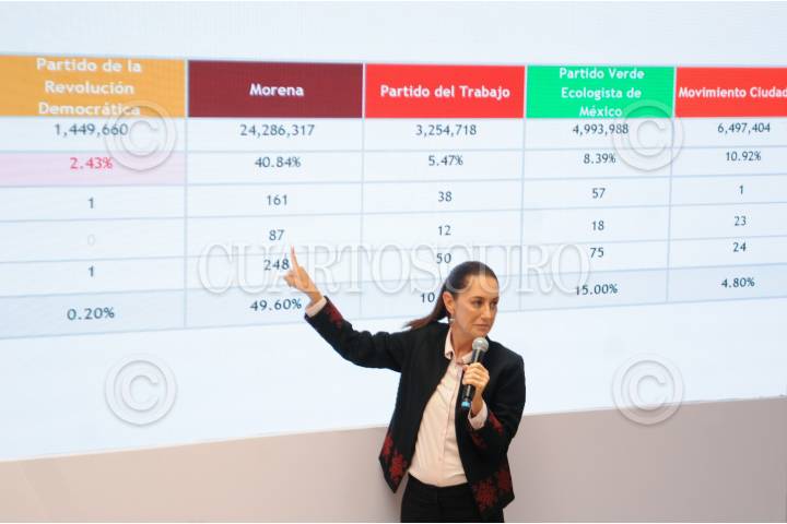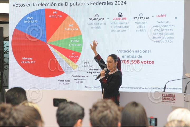 CIUDAD DE MÉXICO, 19AGOSTO2024. - Claudia Sheinbaum, presidenta electa, muestra a la prensa como Morena no tiene una sobrerrepresentación en la Cámara de Diputados. FOTO: DANIEL AUGUSTO /CUARTOSCURO.COM