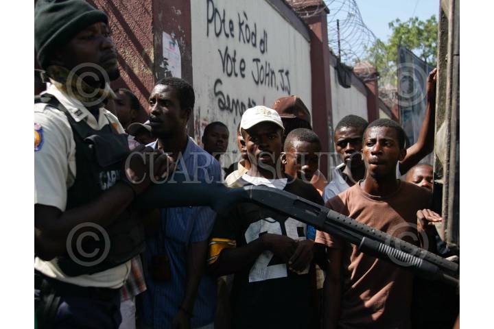 CARREFOUR, HAITI, 30ENERO2010.- Policías custodian un descargue de agua en Carrefour, zona metropolitana de Puerto Príncipe. Miles de haitianos están desesperados debido a que no tienen agua, alimento y medicinas. FOTO: ISAAC ESQUIVEL/CUARTOSCURO.COM