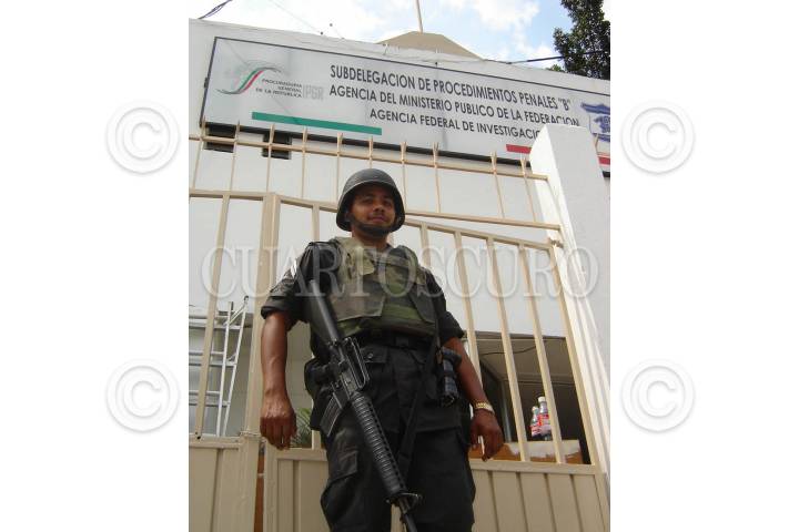 MÉXICO D.F. 18DICIEMBRE2007.-Elementos de la policía pertencientes al grupo GERI y Fuerza de Tarea de la SSP custodian la 50 agencia del ministerio Público, despues de que esta madrugada fueran detenidos cinco sujetos en la delegación de Tlalpan con armamento, granadas, lanza granadas, metralletas y cartuchos, esto en dos vehiculos que son analizados por los peritos. FOTO: PEDRO MARRUFO/CUARTOSCURO.COM