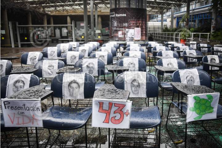 CIUDAD DE MÉXICO, 26SEPTIEMBRE2024.- En uno de los patios de la Facultad de Filosofía y Letras de la Universidad Nacional Autónoma de México (UNAM) fueron colocadas butacas con imágenes de los 43 estudiantes normalistas desaparecidos de Ayotzinapa. FOTO: MARIO JASSO/CUARTOSCURO.COM
