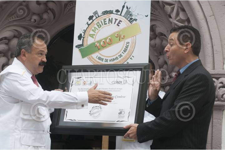 MÉXICO, D.F., 07ABRIL2014.- Armando Ahued, secretario de Salud del Distrito Federal, entregó reconocimientos a una cafetería y a dos restaurantes de la colonia Condesa por promover los espacios públicos 100% libres de humo de tabaco, esto en el marco del día mundial de la Salud. FOTO: DIEGO SIMÓN SÁNCHEZ /CUARTOSCURO.COM