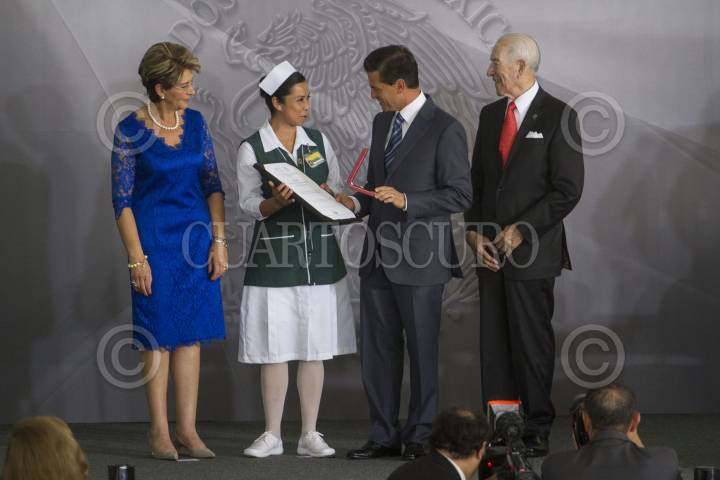 MÉXICO, D.F., 07ABRIL2015.- El presidente Enrique Peña Nieto y Mercedes Juan López, titular de la Secretaría de Salud, entregaron reconocimientos a la enfermera Mónica Sofía Córdova, entre otros, durante la conmemoración del Día Mundial de la Salud. FOTO: ISAAC ESQUIVEL /CUARTOSCURO.COM
